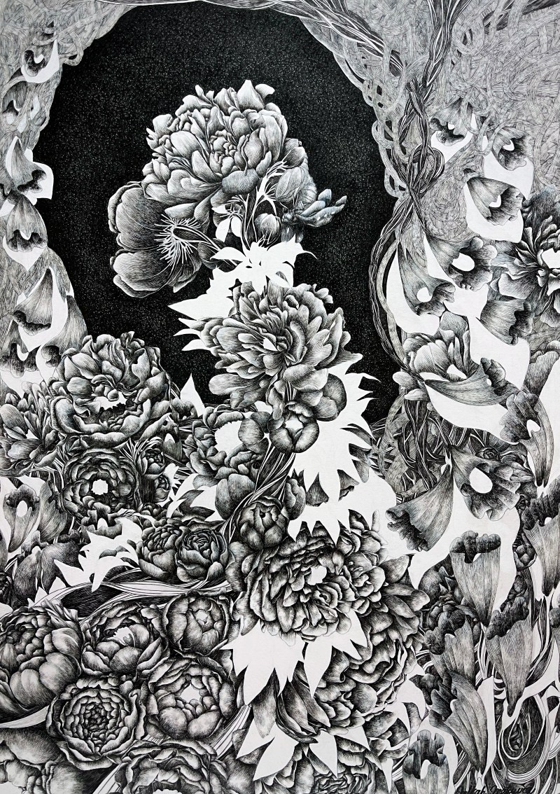 • 花が織りなす幻想的な世界を描く松浦蜜柑によるペン画(写真提供:POA Gallery)