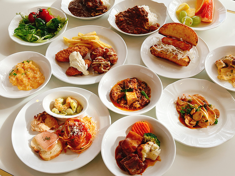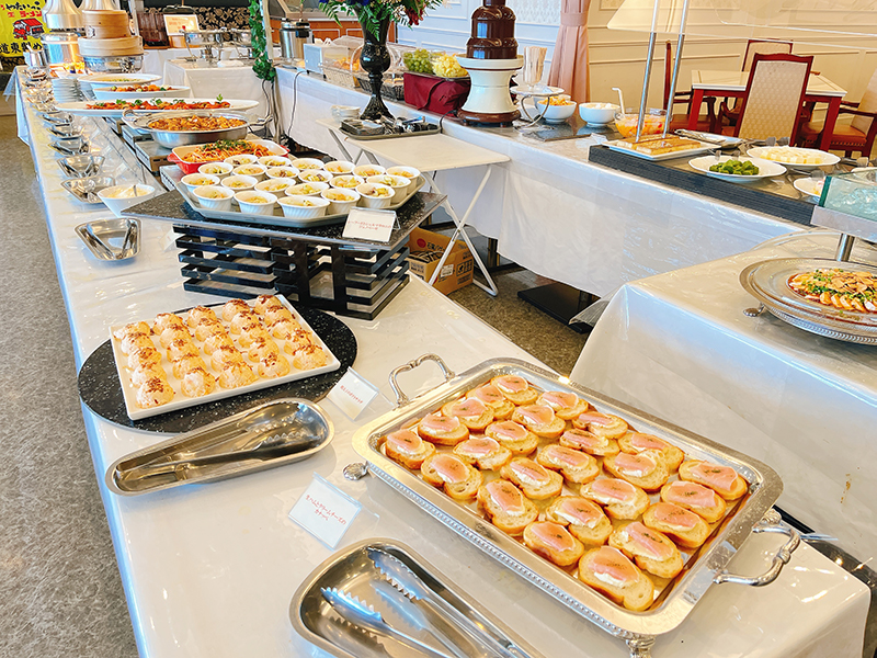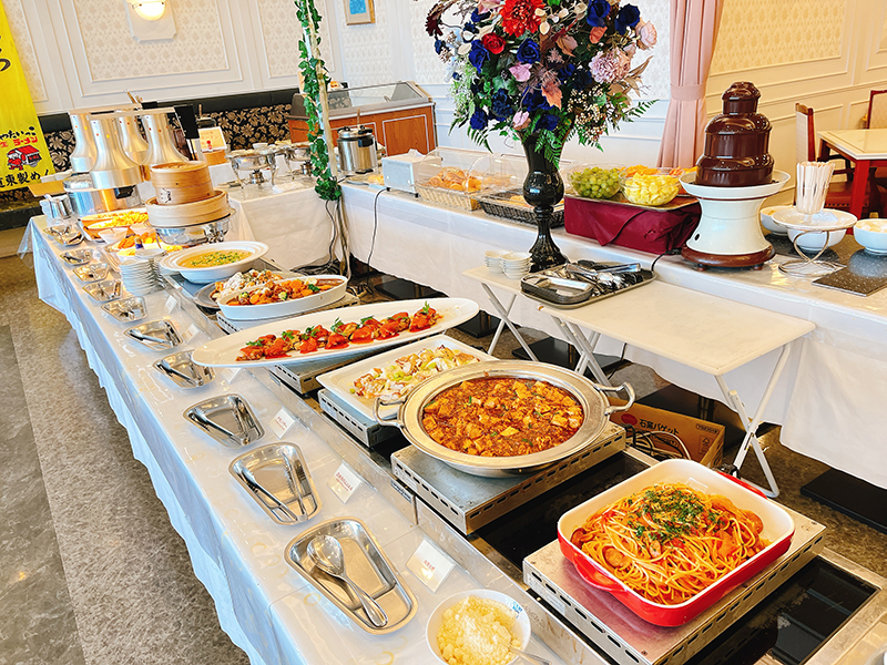ビュッフェ台はアイランド式で外周のどこからでも料理を取ることができる