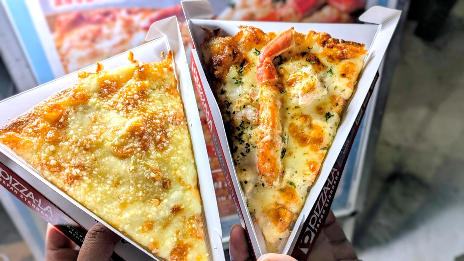 「粉雪パルメザンのフォルマッジピザ」(1ピース800円)(左)と「プレミアム・紅ズワイガニクリーミーピザ」(1ピース1000円)(右)