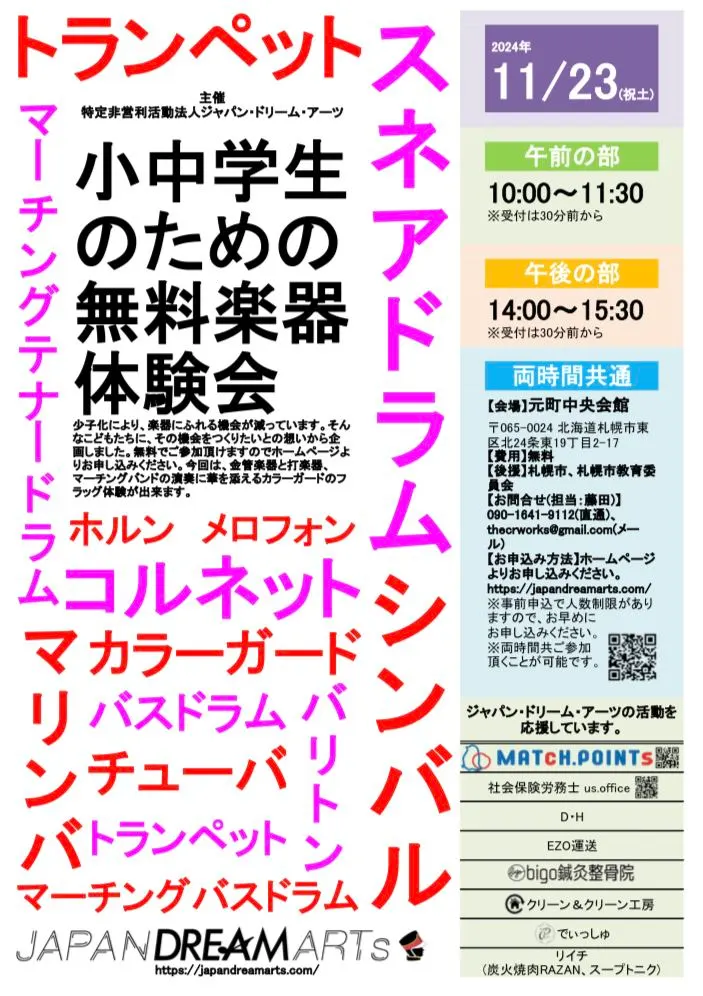 Due to the declining birth rate, there are fewer opportunities for children to experience musical instruments. We have planned this event with the hope of creating opportunities for such children. Please register from the website for free of charge. This time, you can experience playing brass and percussion instruments, as well as color guard flags that add color to the marching band's performance.